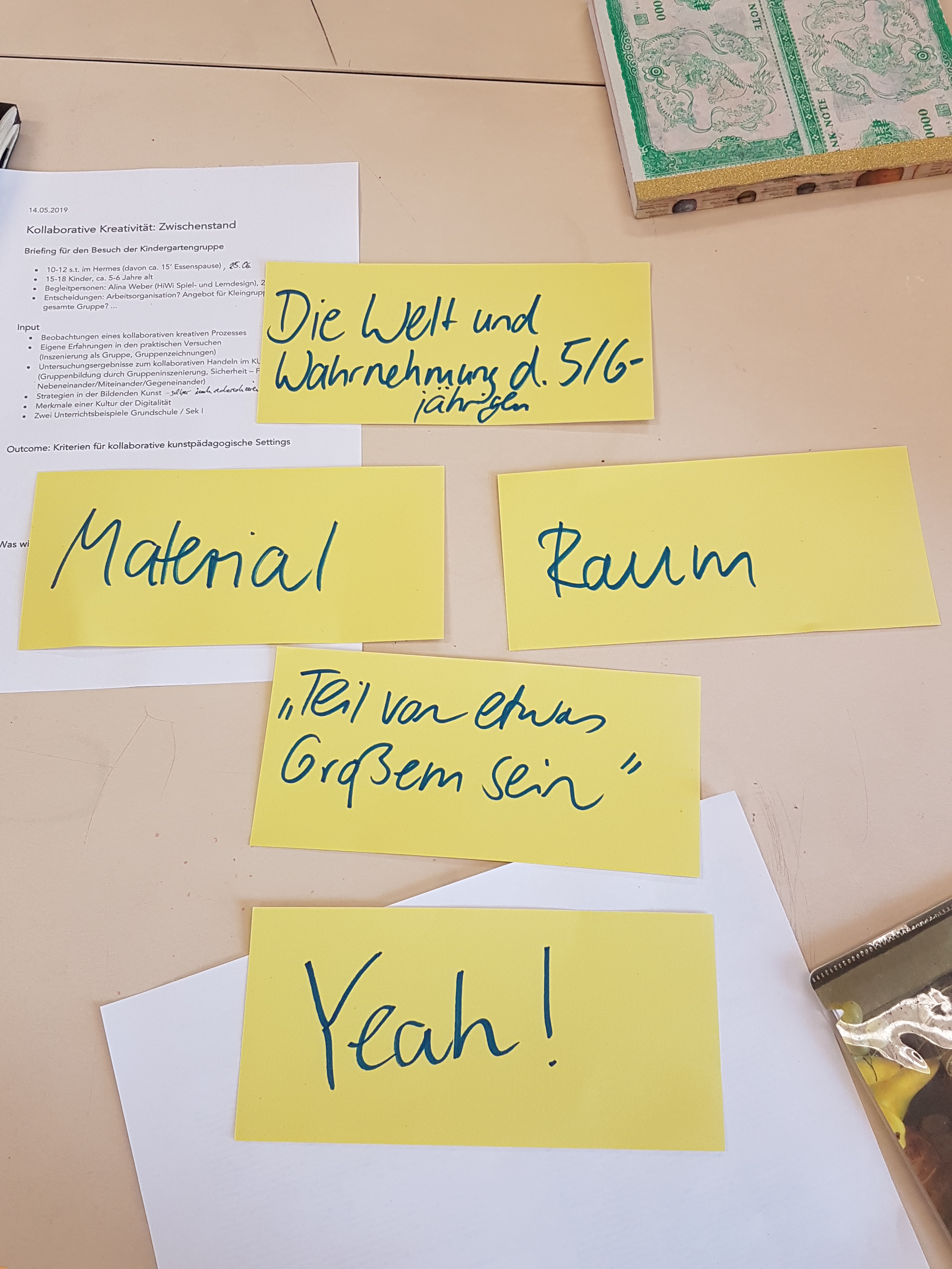 Wie sich herausstellte, war die Planung eines 90minütigen Angebots für Kindergartenkinder eine große, aber auch besonders lehrreiche Herausforderung für die Teilnehmerinnen, die die sich in ihrem Kunststudium eigentlich auf die Lehre an Gymnasien und Gesamtschulen vorbereiten. Sie erfuhren sich selbst als Seminargruppe in einem gemeinsamen kreativen Prozess, konnten die Herausforderungen und Potentiale gemeinsamen kunstdidaktischen Handelns aus der Praxis heraus vertiefend reflektieren sowie aus der fast schon existentiellen Erfahrung mit den ganz Kleinen wichtige Schlüsse für ihre spätere Arbeit mit älteren Schüler*innen ziehen.