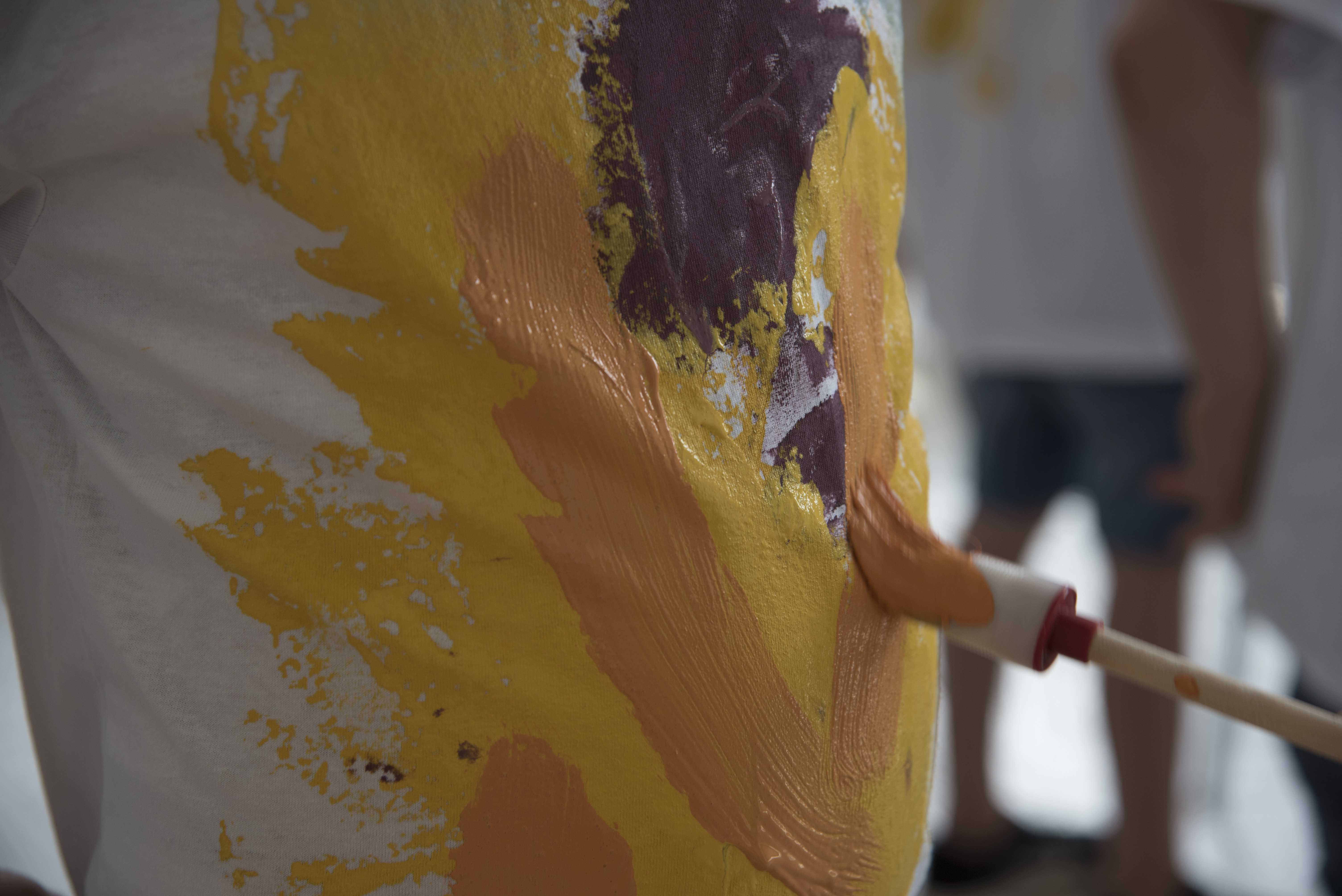 Praktische Erprobungen begleiteten das Seminar. Sie mündeten – in Kooperation mit dem BURG-Studiengang Spiel- und Lerndesign – in der gemeinsamen Entwicklung und Durchführung eines kollaborativen kunstpädagogischen Settings für eine Gruppe aus der BurgKita. In drei aufeinander aufbauenden Phasen ermöglichten die Studierenden den Kindern Berührungen und Bewegungen mit Farbe, Körper und Material – eine eindrucksvolle ästhetische Erfahrung für alle Beteiligten. Vielen Dank an Prof. Karin Schmidt-Ruhland, die Leiterin des Studiengangs Spiel- und Lerndesign, für die Einladung zu diesem aufregenden Experiment!