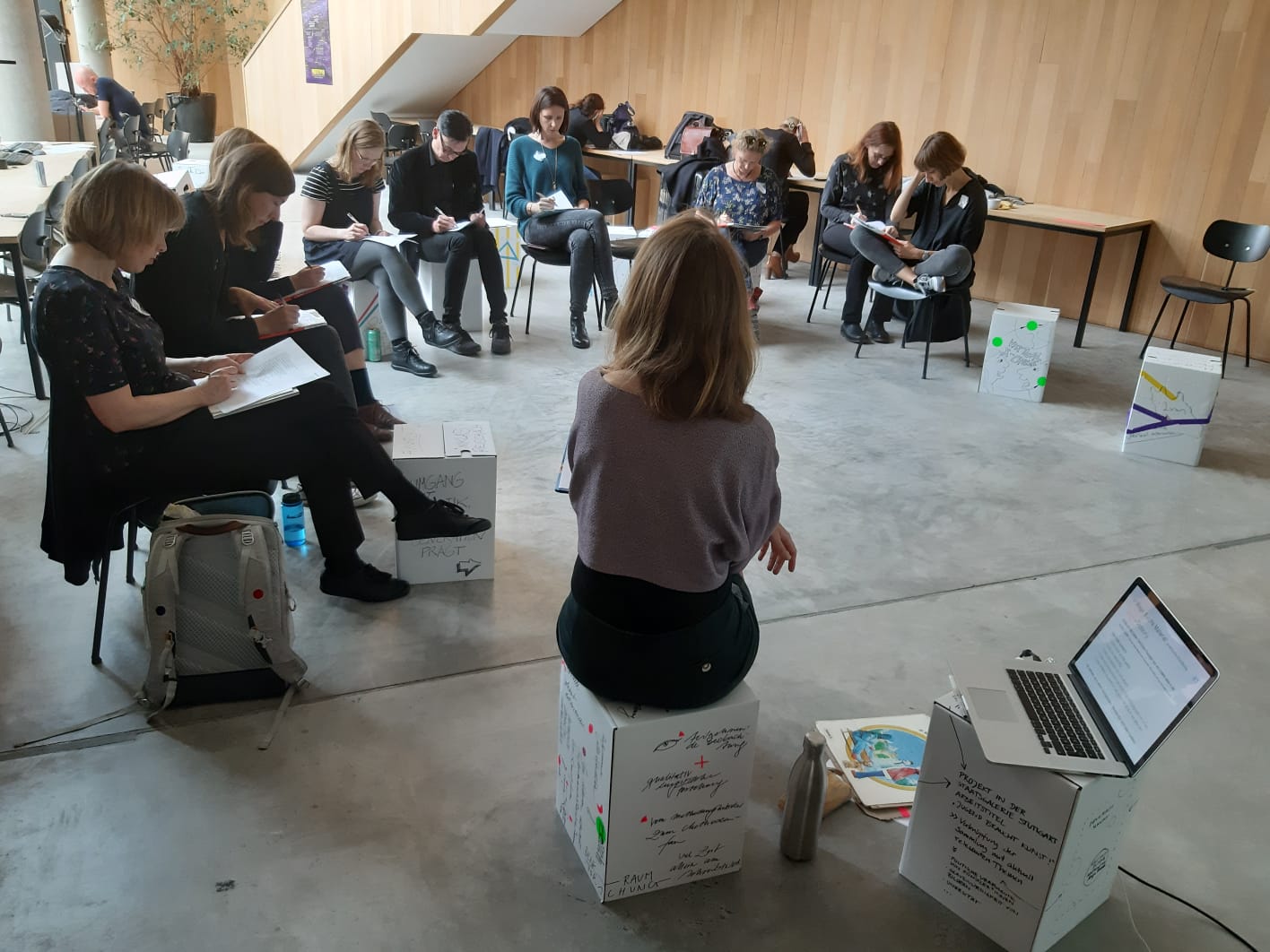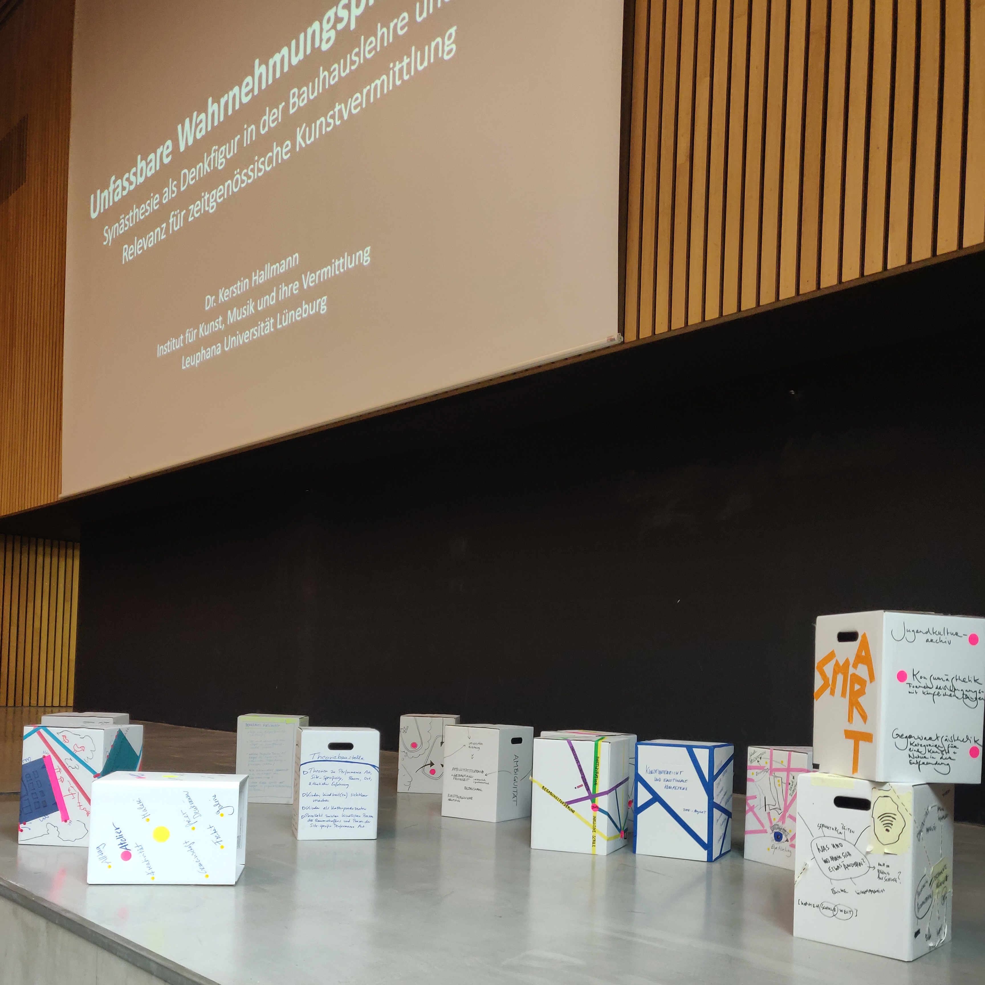 Faltbare Papphocker wurden zu Bausteinen, die zunächst den Raum für eine mehrdimensionale Auseinandersetzung mit den individuellen kunstpädagogischen Zugängen, Perspektiven und Themen boten und dann die Bezüge und Verortungen der einzelnen Positionen in einem gemeinsamen Denkraum sichtbar und kommunizierbar machten.